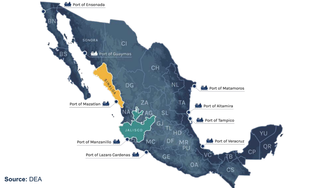Asimismo, señala que una larga historia de alianzas con grupos delictivos que operan en el estado de Colima dan al Cártel de Sinaloa acceso al puerto de Manzanillo. Detalla que este puerto es estratégicamente importante tanto por su ubicación como por su alto volumen de tráfico marítimo, debido al uso generalizado de la terminal portuaria por parte de muchos países para intercambiar bienes de comercio legítimo con México y para reabastecerse de combustible.