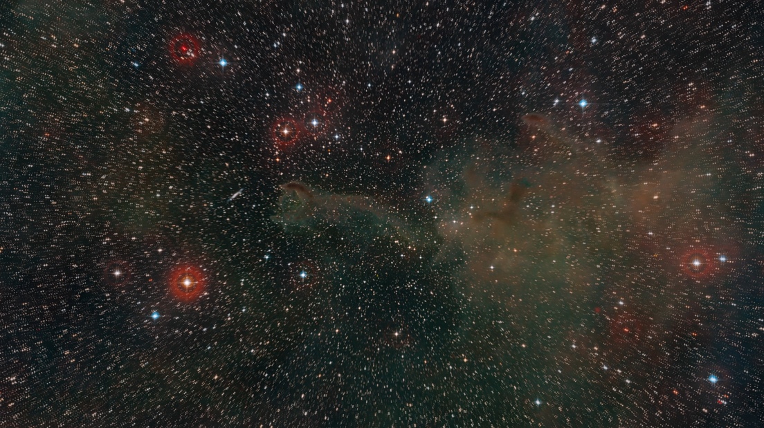 Sin embargo, el filtro especial de hidrógeno-alfa de la cámara de energía oscura puede captar el tenue brillo rojo del hidrógeno ionizado presente dentro de la cabeza de CG 4 y alrededor de su borde exterior. Esta luz se produce cuando el hidrógeno se excita después de ser bombardeado por la radiación de estrellas masivas y calientes cercanas.