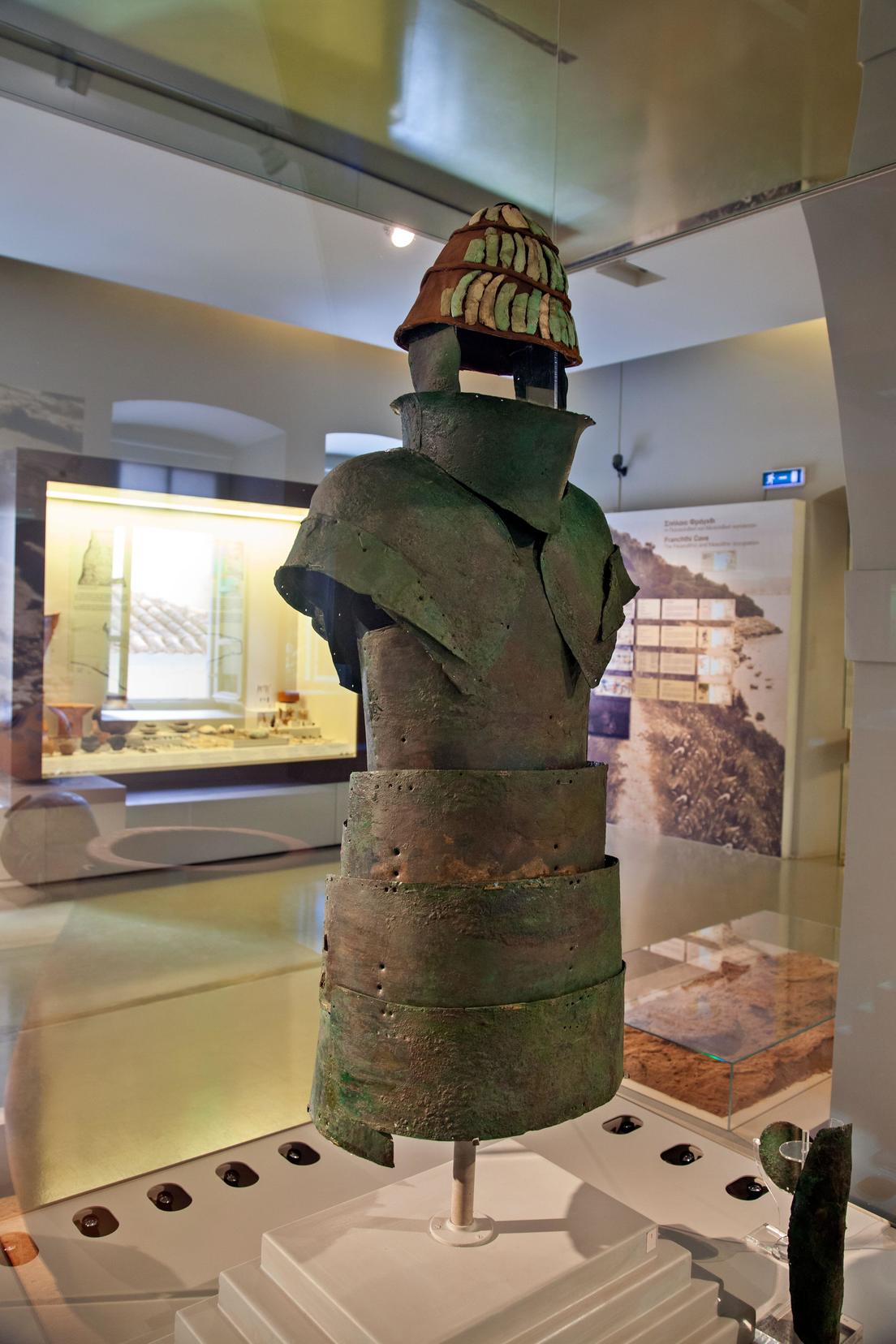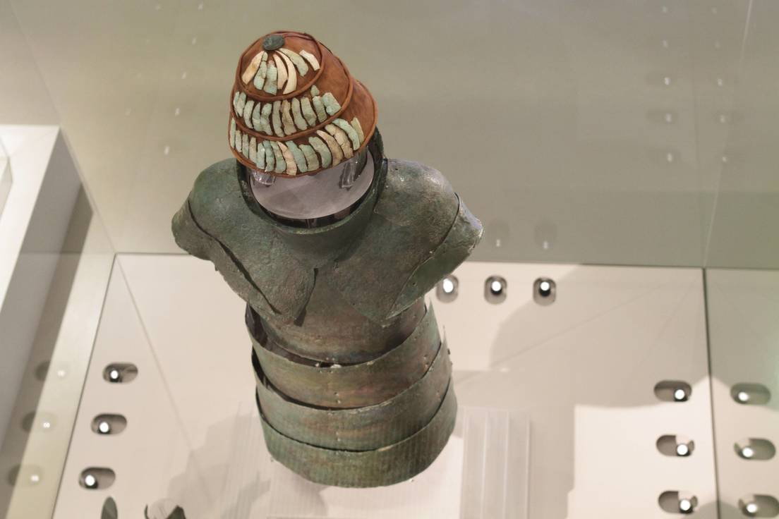 Esta armadura de bronce, uno de los mejores y más completos ejemplos de equipamiento bélico de la época micénica, fue descubierta por arqueólogos en una tumba en el pueblo griego de Dendra en los 1960.