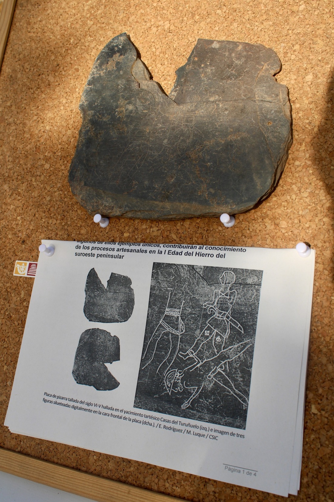 Este martes, el Consejo Superior de Investigaciones Científicas (CSIC) de España anunció que sus expertos están investigando una serie de signos inscritos en una tablilla de pizarra del yacimiento tartésico de Casas del Turuñuelo (Guareña, Badajoz). Las primeras interpretaciones de una secuencia de signos trazados en el marco de la tablilla, en la que también se hallaron figuras de tres guerreros, apuntan a que se trataría de un abecedario.