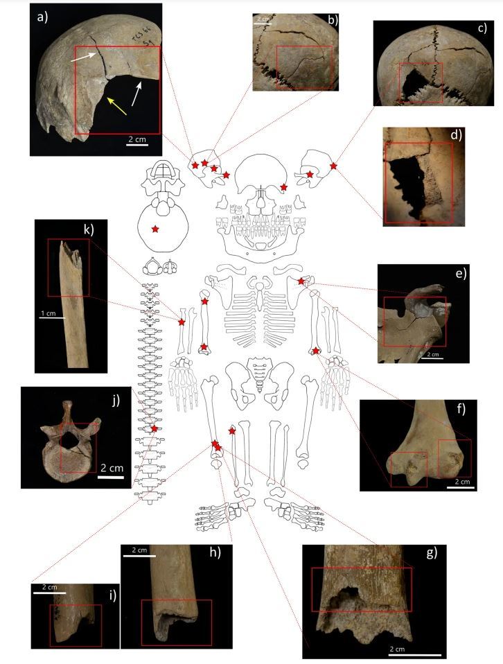 Los científicos descubrieron que no había vínculos familiares evidentes entre las personas encontradas: tres niños y 17 adultos, la mayoría de los cuales eran jóvenes y 15 parecían ser hombres. Alrededor de la mitad habían sufrido traumatismos por objeto contundente, pero la mayoría en el cráneo y no en las extremidades, como suele ocurrir en los colapsos. Esto sugiere que sufrieron golpes que les fueron infligidos por otras personas.