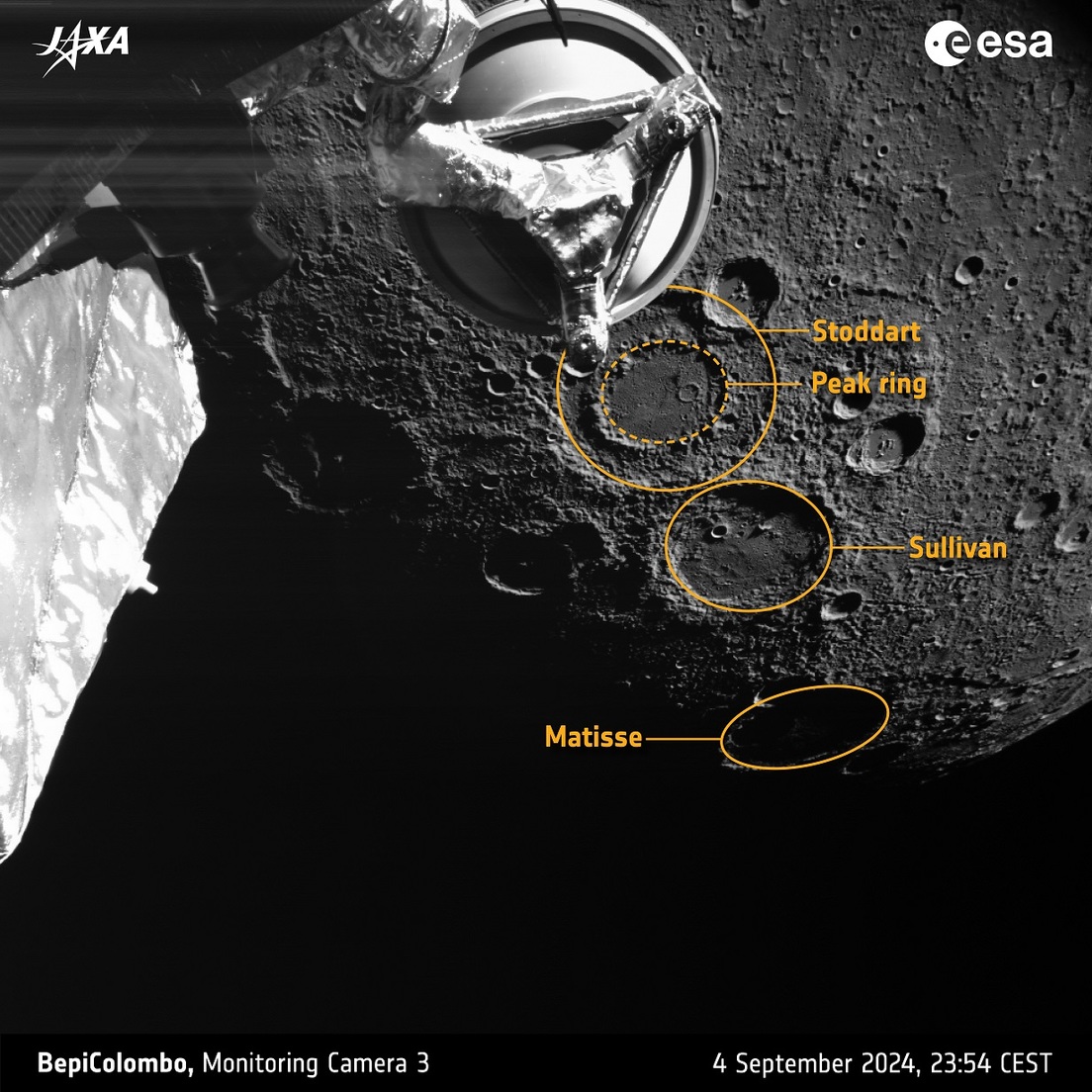 Las imágenes de las tres cámaras ofrecen una vista única de la superficie de Mercurio desde tres ángulos diferentes. BepiColombo captó unos misteriosos cráteres, creados por poderosos impactos de asteroides o cometas y que miden entre 130 y 330 km de diámetro, denominados 'cuencas de anillos de cumbres', por el anillo interior de picos que se encuentra sobre un suelo plano. Las cuencas de los anillos de cumbre son objetivos de alta prioridad de investigación en esta misión.