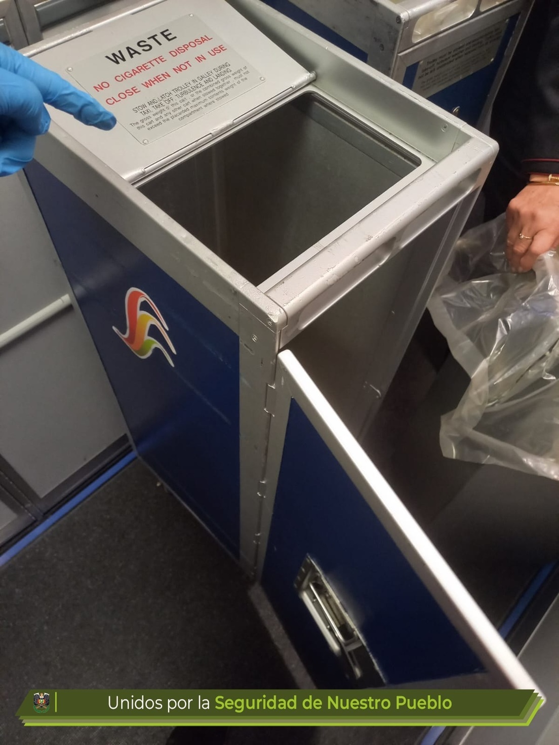 En una conferencia de prensa, el ministro de Gobierno de Bolivia, Eduardo del Castillo, informó que la mitad de los paquetes fueron escondidos en el basurero de la aeronave y el resto fue envuelto con cinta adhesiva en otra parte. Se trata de cocaína valorada en más de 285.000 dólares.