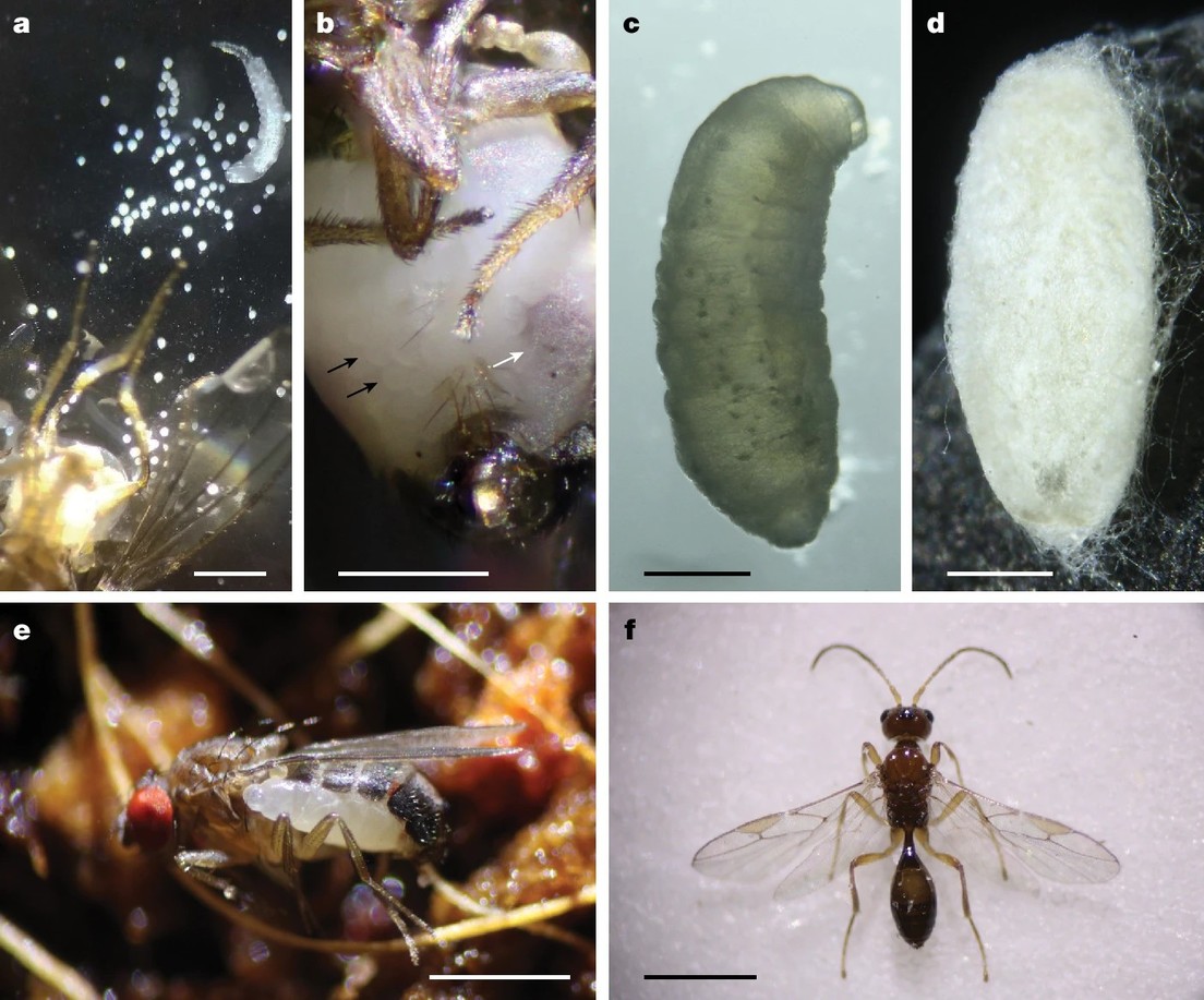 El autor principal del estudio, Logan Moore, explicó a Live Science que las hembras de 'S. perlmani' usan su aguijón para apuñalar y depositar un huevo dentro del abdomen de la mosca. Luego, el huevo eclosiona y se convierte en una pequeña larva, que crece dentro de la mosca durante unos 18 días antes de abandonar el cuerpo de su huésped, dejándolo herido de muerte.