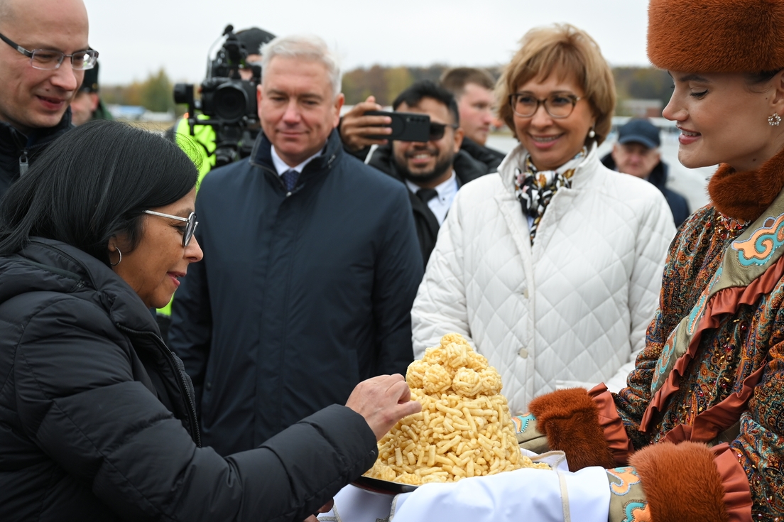 Justo al final de la guardia de honor, delante de los aviones y de la alfombra roja, los visitantes son agasajados por muchachas vistiendo atuendos nacionales con dos tradicionales productos de bienvenida: el chak-chak, un dulce tártaro, y un pan típico ruso con sal.
