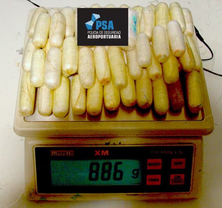 Sin embargo, su plan quedó frustrado cuando la Policía de Seguridad Aeroportuaria de Ezeiza detectó en él un comportamiento extraño y procedió a revisarlo con un escáner corporal, lo que permitió descubrir que tenía los intestinos repletos de dedales de cocaína.