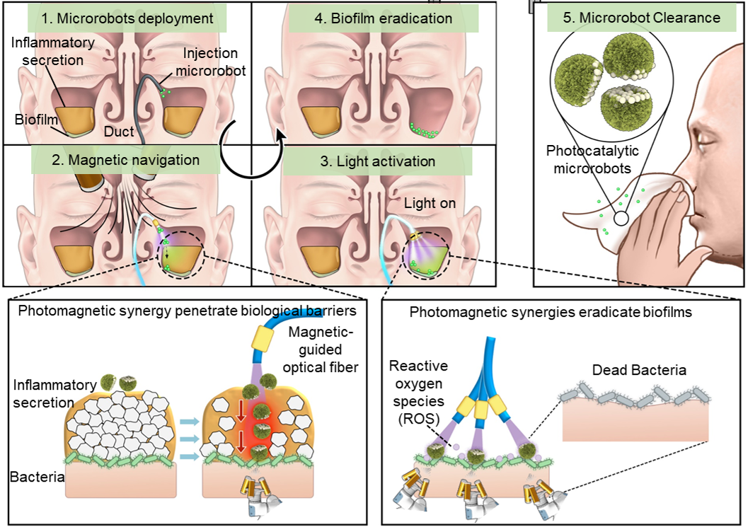 Científicos de la Universidad China de Hong Kong (CUHK), en colaboración con las universidades de Shenzhen y Guangxi, ha desarrollado una innovadora terapia basada en microrrobots fotocatalíticos (CBMR) para tratar infecciones sinusales causadas por biopelículas bacterianas, que son comunidades microbianas generalmente compuestas por bacterias.