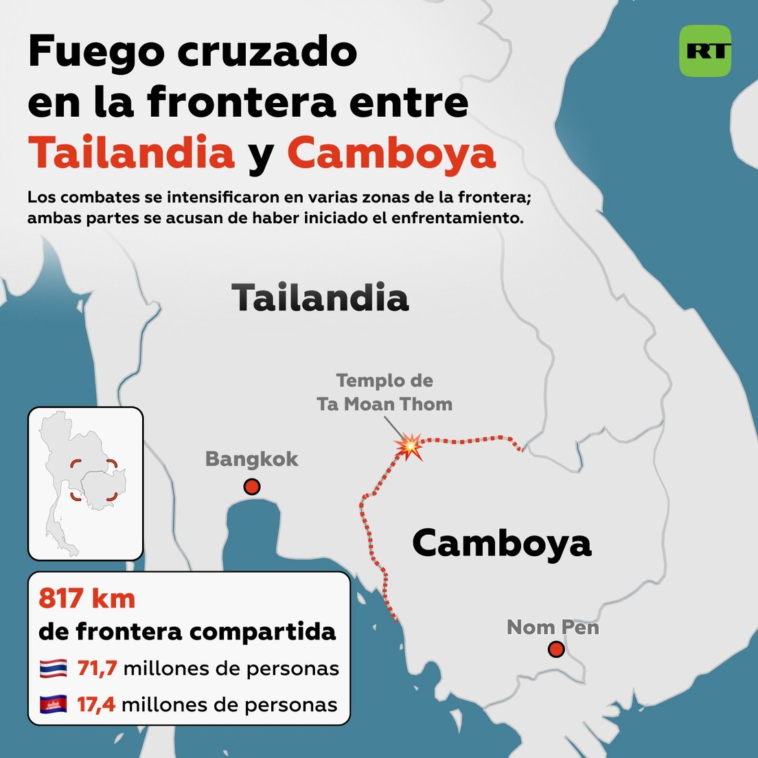 La situación se da en medio de un enfrentamiento armado que estalló en la madrugada de este jueves. Tailandia denunció que tropas camboyanas dispararon primero cerca del templo de Ta Moan Thom, hiriendo a dos soldados tailandeses. Por su parte, el Ministerio de Defensa de Camboya afirmó que sus fuerzas respondieron con fuego en defensa propia tras haber sido atacadas.