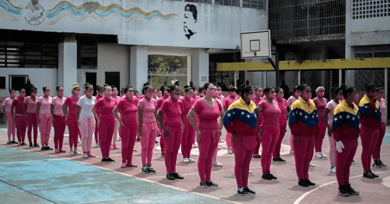 En la entrada del penal se observa a un grupo de internas con uniformes de color rosa, fucsia y verde, que se forman para dar la bienvenida con la consigna: "Humanización, respeto, orden y disciplina hacia la mujer y el hombre nuevo".