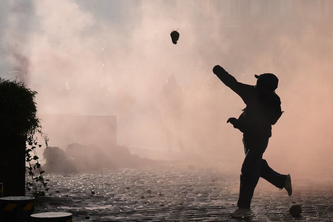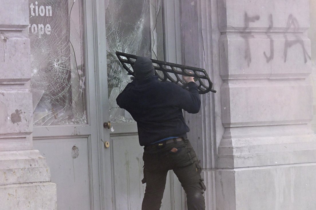 Participante de las manifestaciones rompiendo un cristal.Didier Lebrun / Photonews