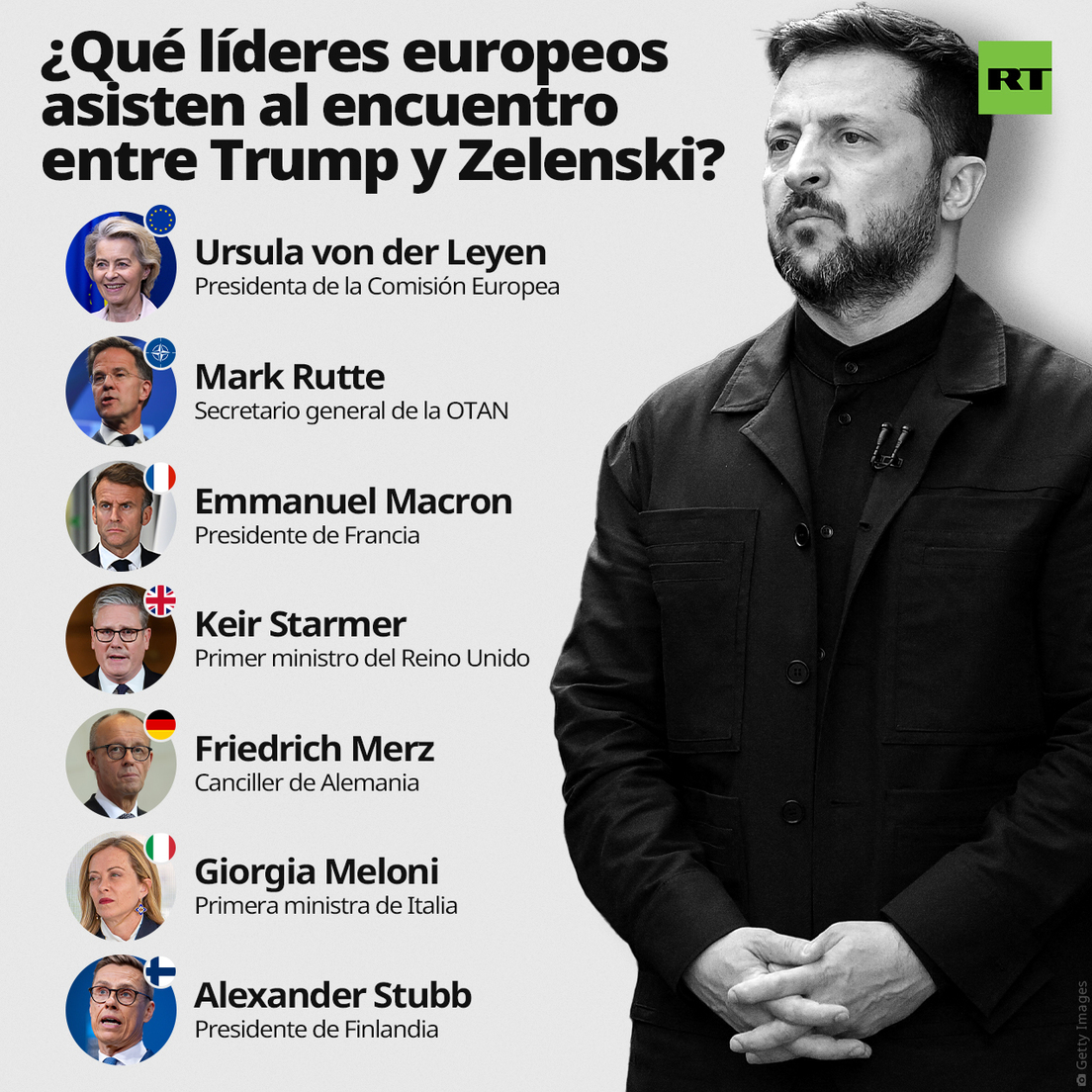 - Tras la cumbre Putin-Trump, siete líderes europeos acompañaron a Zelenski a Washington, a su reunión con el mandatario estadounidense. En el encuentro en la Casa Blanca el 18 de agosto de 2025 estuvieron presentes la presidenta de la Comisión Europea, Ursula von der Leyen; el secretario general de la OTAN, Mark Rutte; el presidente de Francia, Emmanuel Macron; el canciller de Alemania, Friedrich Merz; el primer ministro del Reino Unido, Keir Starmer; la primera ministra de Italia, Giorgia Meloni; el presidente de Finlandia, Alexander Stubb.