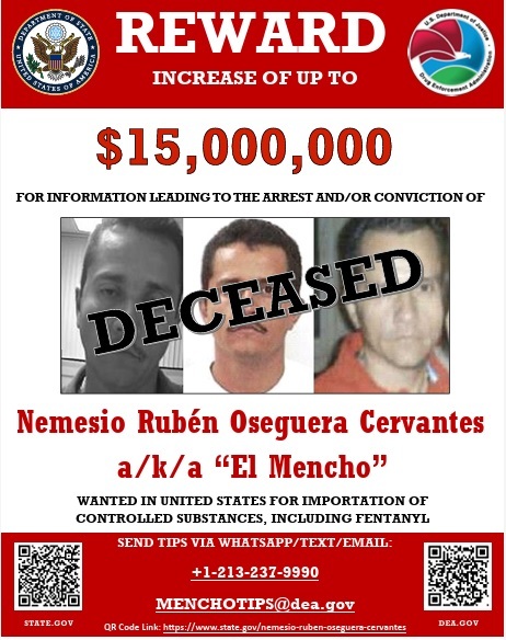 El Departamento de Estado de Estados Unidos declaró oficialmente muerto a Nemesio Oseguera Cervantes, alias 'El Mencho', jefe del Cártel Jalisco Nueva Generación (CJNG) por el que ofrecía una recompensa de hasta 15 millones de dólares.