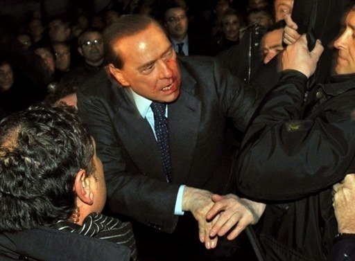 Las imágenes televisivas mostraron que los asistentes levantaron a Berlusconi del suelo y éste tenía sangre bajo la nariz y en la boca. El ataque ocurrió mientras el mandatario, de 73 años, firmaba autógrafos junto a su automóvil.