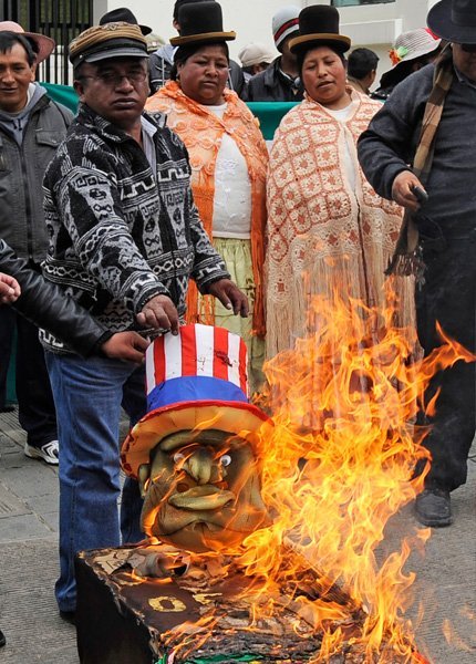 Jorge Bernal / AFP Las calles de La Paz fueron literalmente tomadas por ciudadanos que esgrimían lemas de condena contra el "imperio yanqui". Algunos de los participantes en la manifestación detonaron petardos e incendiaron varias banderas estadounidenses.