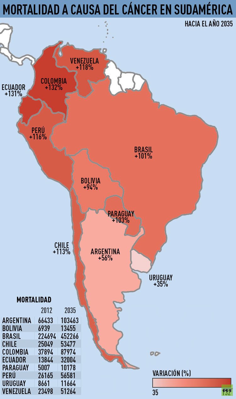 De acuerdo con la OMS, un total de 430.000 personas fallecieron en Sudamérica a consecuencia de cáncer en 2012. Para el año 2035 la proyección regional es de 883.000. Brasil es el país sudamericano con la mayor cantidad de casos nuevos de cáncer y los 437.000 actuales aumentarán en un 90%.