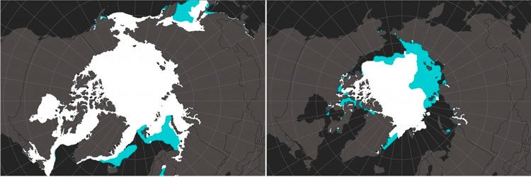 Las fluctuaciones estacionales de las temperaturas en la tierra y en los océanos directamente afectan el volumen del hielo en el Ártico. Bajo unas temperaturas más altas en verano se deshiela y en invierno, vuelve a congelarse. Tradicionalmente, el hielo ártico alcanza su máximo en marzo y su mínimo, en septiembre.