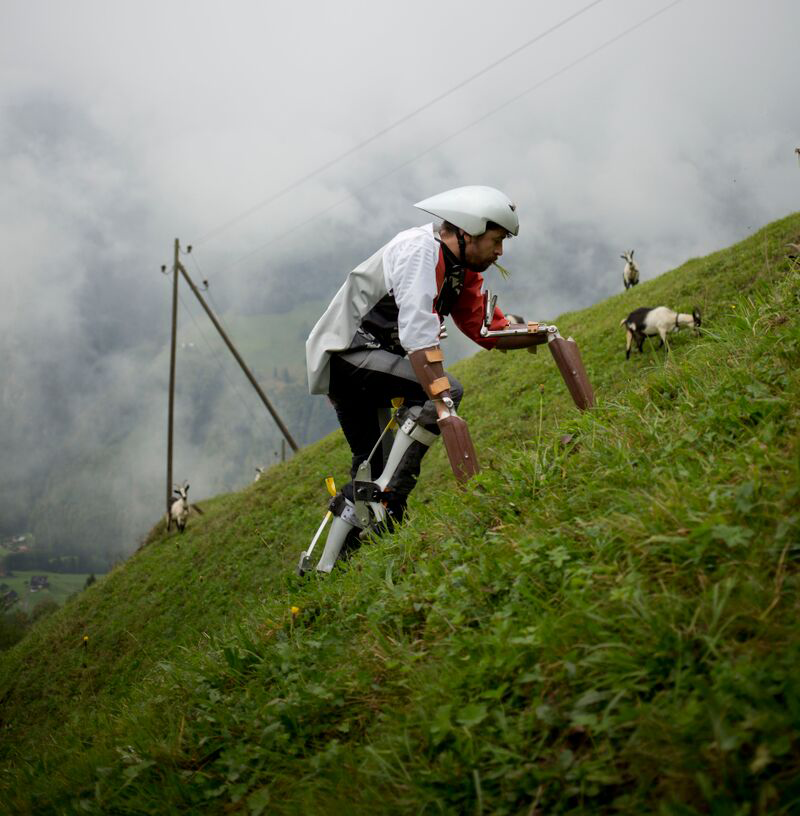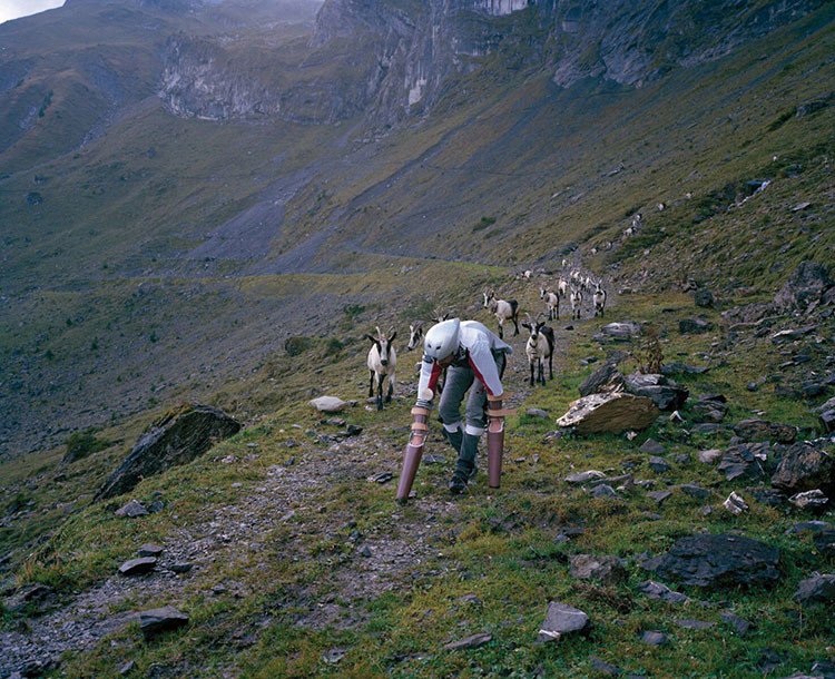 Para convertirse en una cabra, Thwaites se hizo una prótesis para los brazos y las piernas que le permitiera caminar a cuatro patas y estudiar atentamente el comportamiento de estos animales. De hecho, el diseñador vivió como una cabra durante tres días en una granja en los Alpes suizos, entre 'congéneres' reales.
