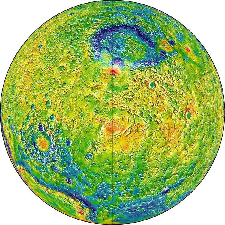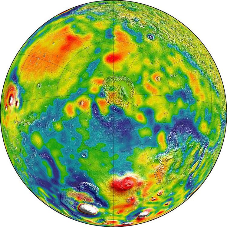 Un nuevo mapa de Marte muestra la gravedad en distintos puntos del planeta gracias a los datos recopilados por tres naves de observación y estudio de la NASA, la nave Mars Global Surveyor, la Mars Odyssey y la Mars Reconnaissance Orbiter, que orbitan en torno al planeta rojo.