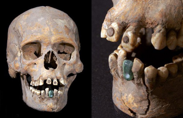 Otra característica distintiva del esqueleto, que demuestra que la mujer era extranjera en Teotihuacán, son las dos piedras redondas de piritas incrustadas en sus dientes frontales superiores, una técnica utilizada en las regiones mayas del sur de México y América Central.