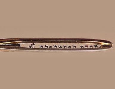 Ojo de una aguja con una caravana de doce camellos y un camellero de oro. Mide 0,25 mm de altura.