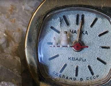 Muñeco de nieve en la manecilla de un reloj. De huesos de mamuts.