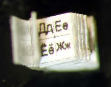 Supermicrolibro. Alfabeto. 0,8 х 0,8 mm. Un surtido de libros que representan distintos alfabetos del mundo, incluso el hebreo, el del Tíbet y el del antiguo Egipto.