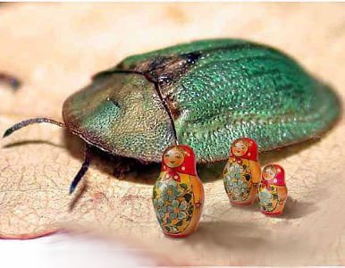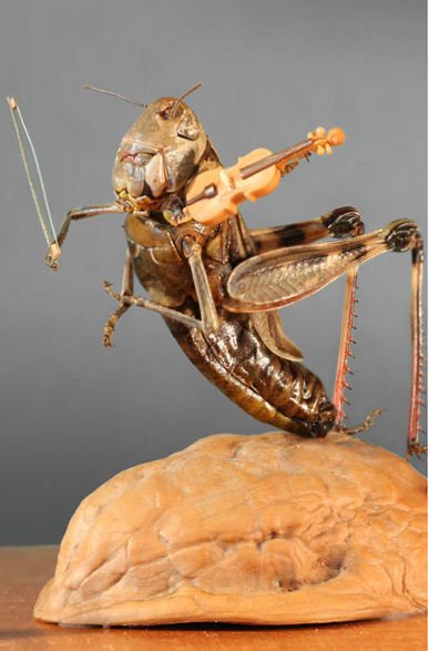 Saltamontes tocando el violín. El instrumento mide 12 mm, hecho de cáscara de nuez y las cuerdas, de fibras de cristal. Tiene todos los elementos de un instrumento verdadero: dentro está la etiqueta con el apellido del creador, la fecha de producción, el país y la ciudad. El saltamontes es real.