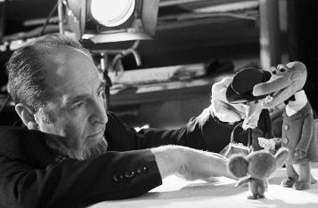 Leonid Shvartsman, uno de los creadores del dibujo animado “Cheburashka”, con sus héroes: el cocodrilo Gena y Cheburashka.