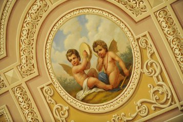 El techo de la sala ya está decorado por los pintorescos paneles con molduras y brillan los famosos candelabros y las lámparas de araña de bronce. Pero las paredes todavía carecen del 'toque' de los restauradores. La sala de coros está destinada a los ensayos del famoso coro del Teatro Bolshoi, por eso este concierto será el único en este lugar.