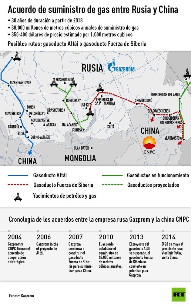 China firmó con Rusia dos contratos históricos de suministros de gas, uno por la ruta occidental, y otro, de unos 400.000 millones de dólares, por la ruta oriental que supone, además, la construcción de un gasoducto y la exploración del yacimiento en conjunto. A medio plazo, los suministros de gas de Rusia a China podrían superar las actuales exportaciones a Europa, según el presidente del gigante estatal gasífero Gazprom, Alexéi Miller.