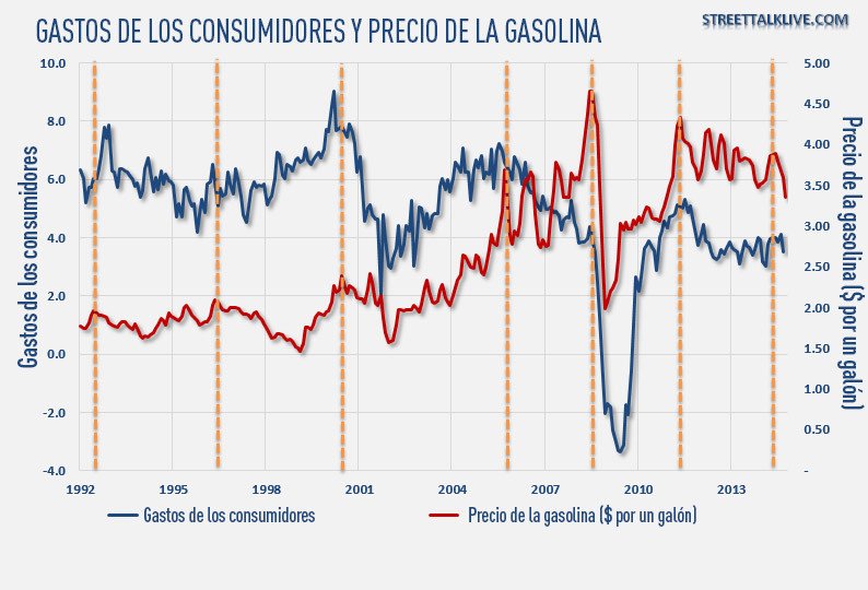 Los economistas esperaban que la caída de los precios de petróleo acarreara un aumento del gasto de los consumidores, pero, como se puede apreciar en la infografía, no siempre ocurre así. A veces cuando cae el precio de combustible, empieza a caer también el gasto.