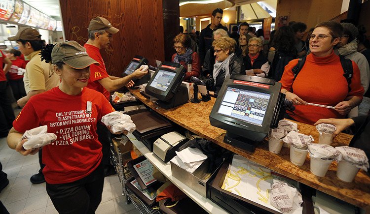 4. "Estamos orgullosos de los puestos de trabajo que creamos", dice McDonald en su página web. La compañía describe como "una oportunidad" los trabajos que ofrece y se elogia a ella misma por la diversidad y la flexibilidad de horarios. Sin embargo en realidad el salario medio de los trabajadores que sirven a los clientes es de 8,69 dólares la hora (el salario mínimo en EE.UU. es de 7,25 dólares por hora).