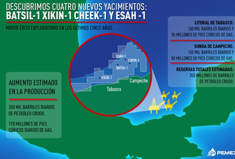 De acuerdo con Lozoya, los campos recién descubiertos en Litoral de Tabasco y en la Sonda de Campeche tienen reservas de unos 350 millones de barriles de petróleo, crudo que aumentaría la producción en 200.000 barriles diarios, informa 'Milenio'.