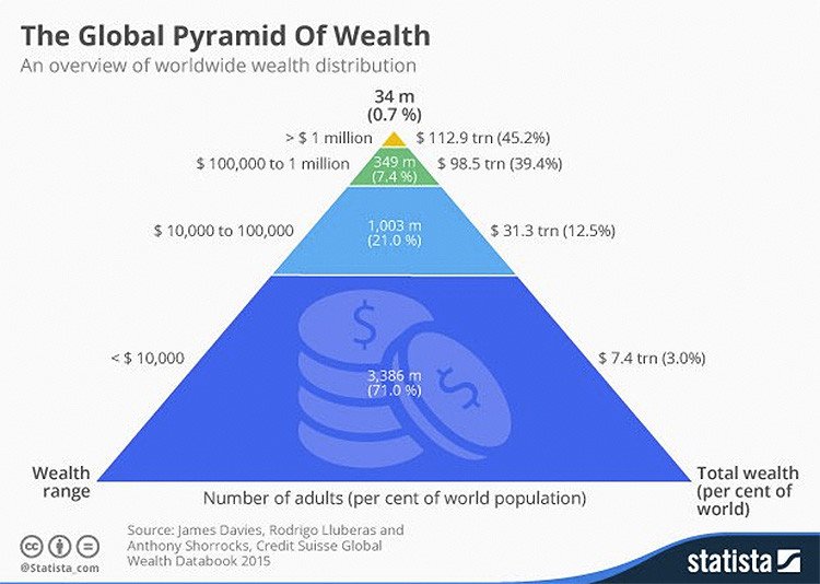 'La pirámide global de la riqueza' que ha publicado Statista.com muestra que 3.386 millones de personas (el 71 % de los adultos del mundo) poseen menos de 10.000 dólares, mientras que 1.003 millones de personas (el 21 % de los adultos) tienen activos financieros entre 10.000 y 100.000 dólares y 349 millones de personas (el 7,4 %) acumulan entre 100.000 y un millón de dólares. En la parte superior de la pirámide, 34 millones de personas (el 0,7 % de los adultos) amasan fortunas superiores al millón de dólares.