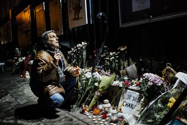 Un hombre reza frente a la Embajada de Francia en Sofía, Bulgaria.