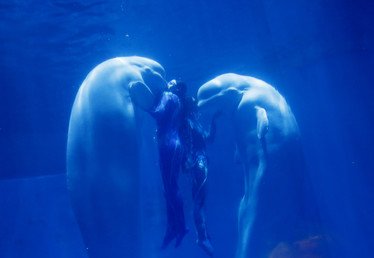 Belugas y sus entrenadores en Harbin, China.