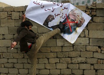 Un afgano da una patada a un cartel con la imagen de un líder religioso pakistaní.