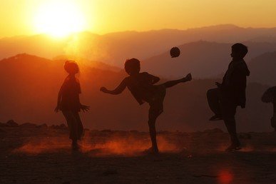 Niños juegan a la pelota al atardecer en Myanmar.