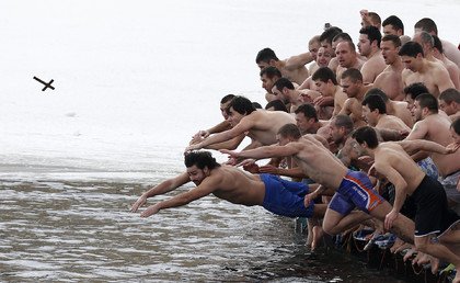 Un grupo de nadadores se lanzan a un lago en pos de una cruz de madera. Sofía (Bulgaria).