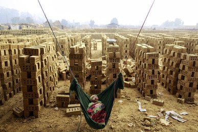 Un niño duerme en una hamaca mientras su madre trabaja en una fábrica de ladrillos, Birmania