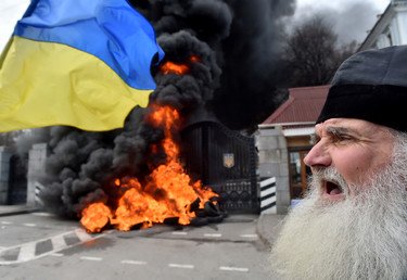Un sacerdote grita cuando miembros del batallón Aidar queman neumáticos en Kiev