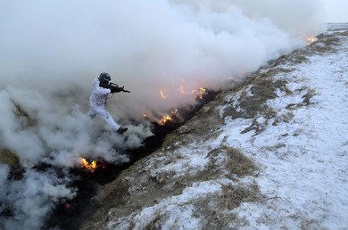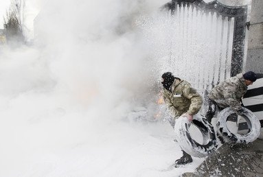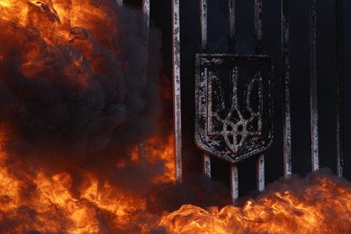 Las llamas de la quema de neumáticos engullen el escudo de Ucrania