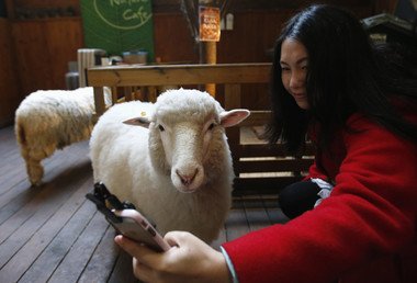 Una mujer se toma una fotografía con una oveja en una cafetería de ovejas en Seúl, Corea del Norte