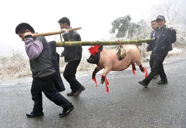 Aldeanos chinos trasportan un cerdo en una calle cerrada al tráfico debido al hielo