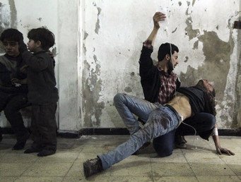 Un hombre presta asistencia médica a un herido en Damasco, Siria