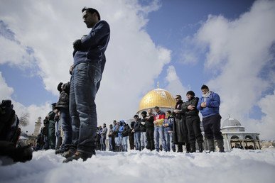 Hombres palestinos rezan en Jerusalén