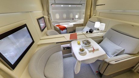 ¿Qué les ofrece un avión a dos pasajeros que han pagado 120.000 dólares por el billete? Lujosos cuartos de baño con ducha, dormitorios con sábanas de algodón egipcio, cocineros personales, teléfonos satelitales individuales e incluso excursiones en globo. La revista 'Forbes' ha elaborado una lista de los vuelos más caros del mundo.