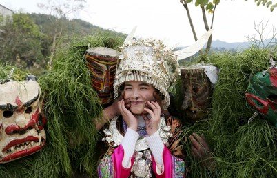 Hombres de la etnia miao con máscaras tradicionales llevan a cabo un ritual para traerle suerte a una mujer, el 16 de febrero durante la celebración local del año nuevo lunar en la región autónoma de Guangxi, China. Reuters