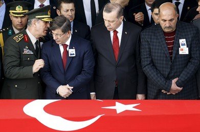 El presidente turco, Tayyip Erdogan, y primer ministro Ahmet Davutoglu asisten el 19 de febrero al funeral de Seckin Cil, un oficial del Ejército muerto durante una ofensiva antikurda en la ciudad de Diyarbakir.Umit Bektas / Reuters