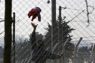 Un refugiado juega con su bebé mientras esperan poder entrar a Macedonia desde Grecia cerca de la ciudad macedonia de Gevgelija. 19 de febrero de 2016.Ognen Teofilovski / Reuters